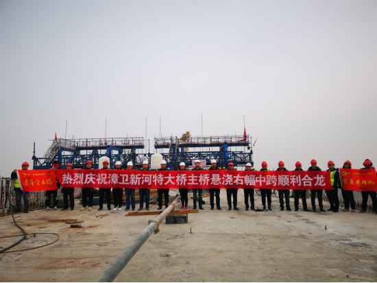 2021年12月10日15时,G0111秦滨高速公路冀鲁接线段工程漳卫新河特大桥主桥完成悬浇,顺利合拢。沧海纳百川,在碧水蓝天的映照下,随着最后一方混凝土泵送完成,漳卫新河特大桥雄壮的身姿已经完整地体现了出来,这预示着距离大桥正式通车又迈出了坚实的一步。