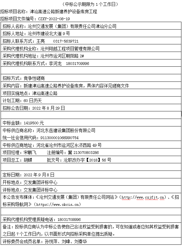 津汕高速公路新建养护设备库房工程中标公告