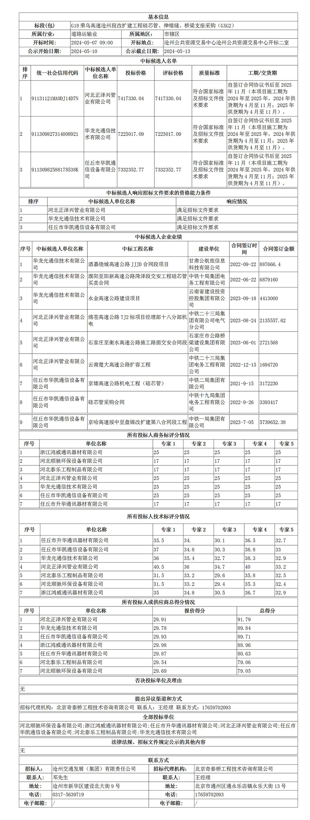 G18荣乌高速沧州段改扩建工程硅芯管、伸缩缝、桥梁支座采购(GXG2)中标候选人公示