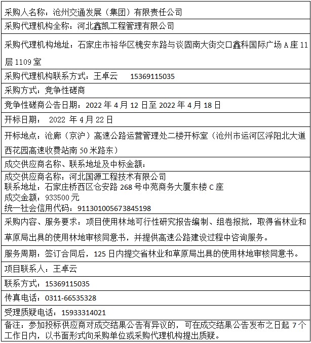 曲港高速公路肃宁互通至京台高速段(肃宁互通至黄骅港段一期工程)项目使用林地可行性研究报告编制 成交结果公告