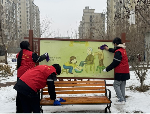活动中,志愿者们拿上工具,分组深入到辖区角角落落,清理辖区的环境卫生死角。同时当天恰逢2024年的第一场雪,志愿者们也带上除雪工具积极扫雪。