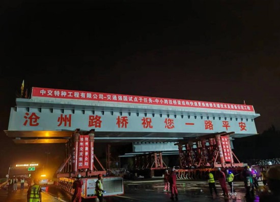 施工前,石黄互通项目部成立工作专班,结合首次快建施工情况对此次施工重点、难点进行分析论证,制定完备的施工技术方案和安全保障措施;施工过程中,技术人员在临时场地内将跨石黄高速公路的钢叠合梁和桥面附属设施一次性制作完成,利用具备不平整路况自适应功能的模块车将钢混叠合梁移运至桥位安装,保证整个移运过程安全平稳;利用北斗导航系统实现对移运路径的精准把控。通过高精度基康传感器,对梁体实时应变开展全方位检测;采用液体静力水准仪及配套测试仪对梁体实时挠度进行检测,做到重要参数全过程实时监控,科学管控施工质量。